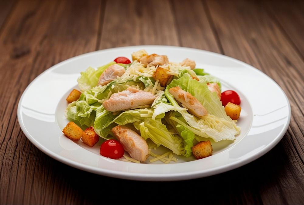 Листья свежего салата с сыром Пармезан, гренками и фирменной заправкой «Цезарь»
