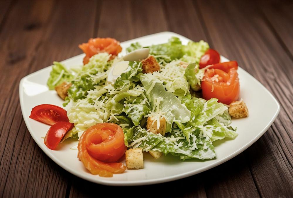 Семга, гренки чесночные, черри, каперсы, сыр «Пармезан» и фирменная заправка «Цезарь»