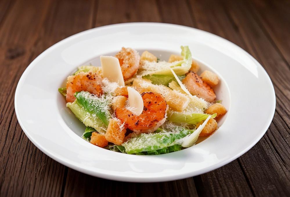 Листья свежего салата с сыром Пармезан, гренками и фирменной заправкой «Цезарь»)