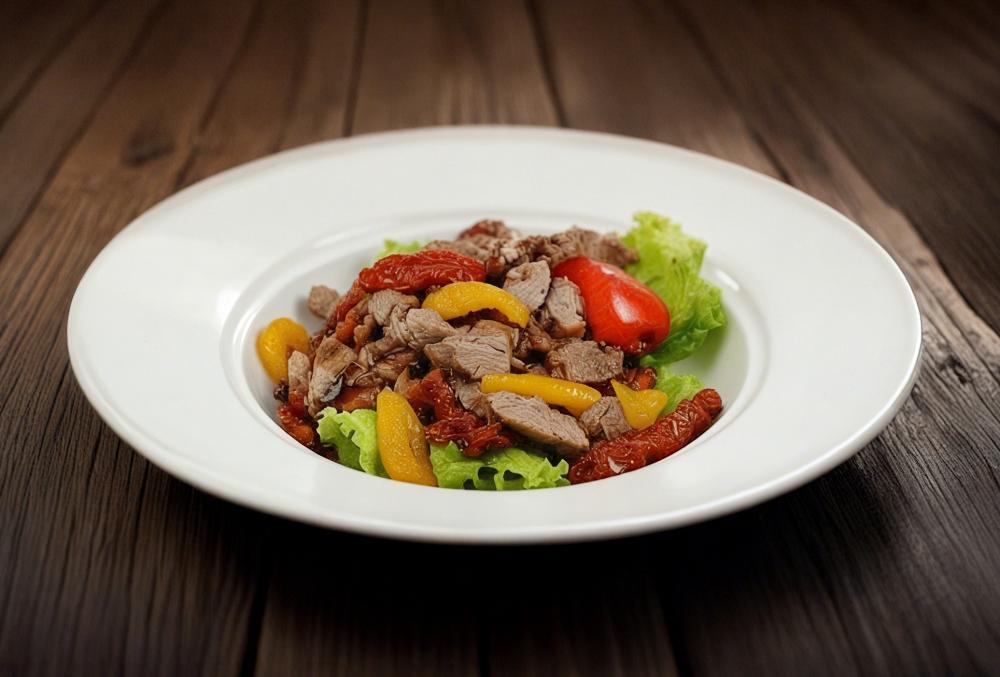 Обжаренная вырезка говядины, помидоры вяленые, грибы жаренные, зелень
