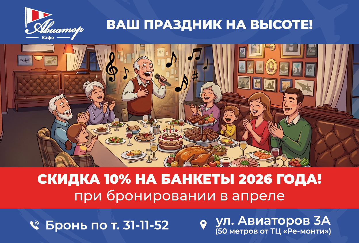 *Скидка не суммируется с другими акциями в кафе. Действует на завтраки, обеды и ужины в кафе "Авиатор".