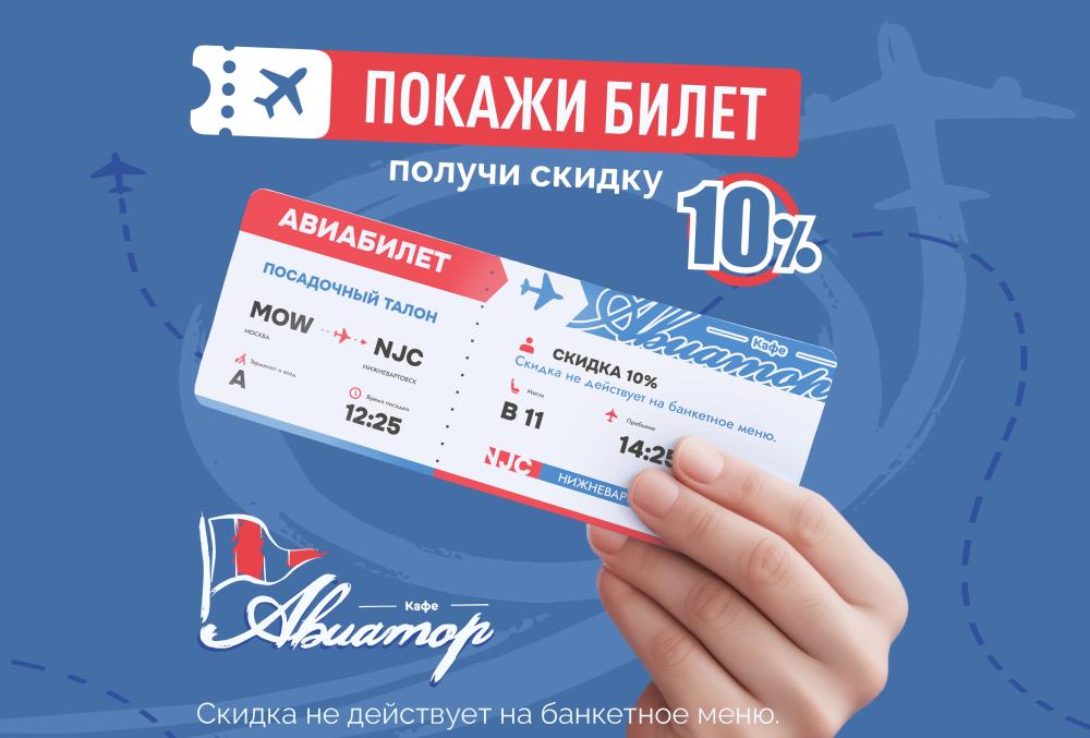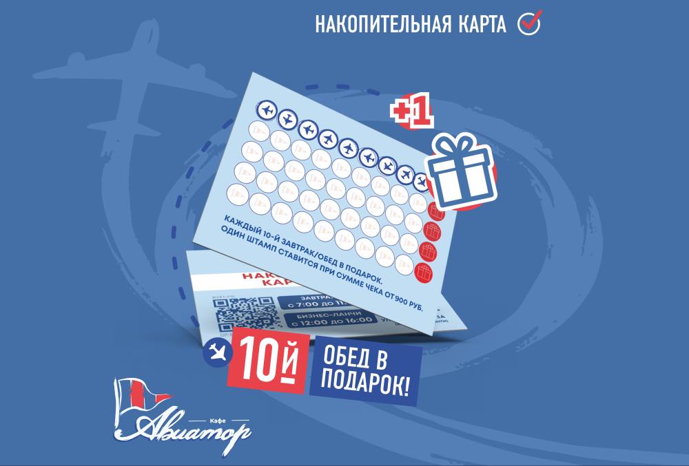 при оплате завтрака, обеда или ужина от 900 руб. в кафе "Авиатор", можно получить накопительную карту, по которой каждый 10-й обед в подарок